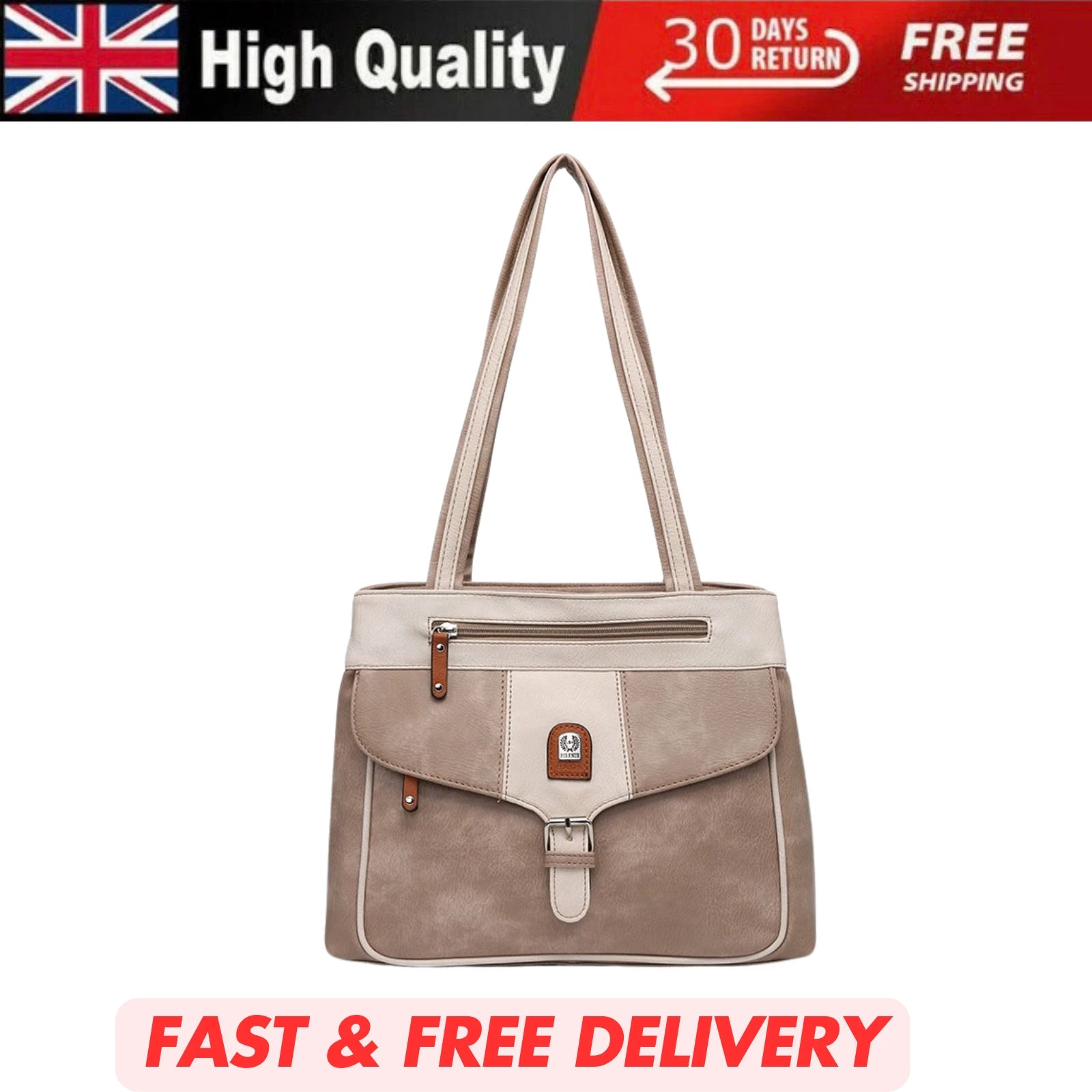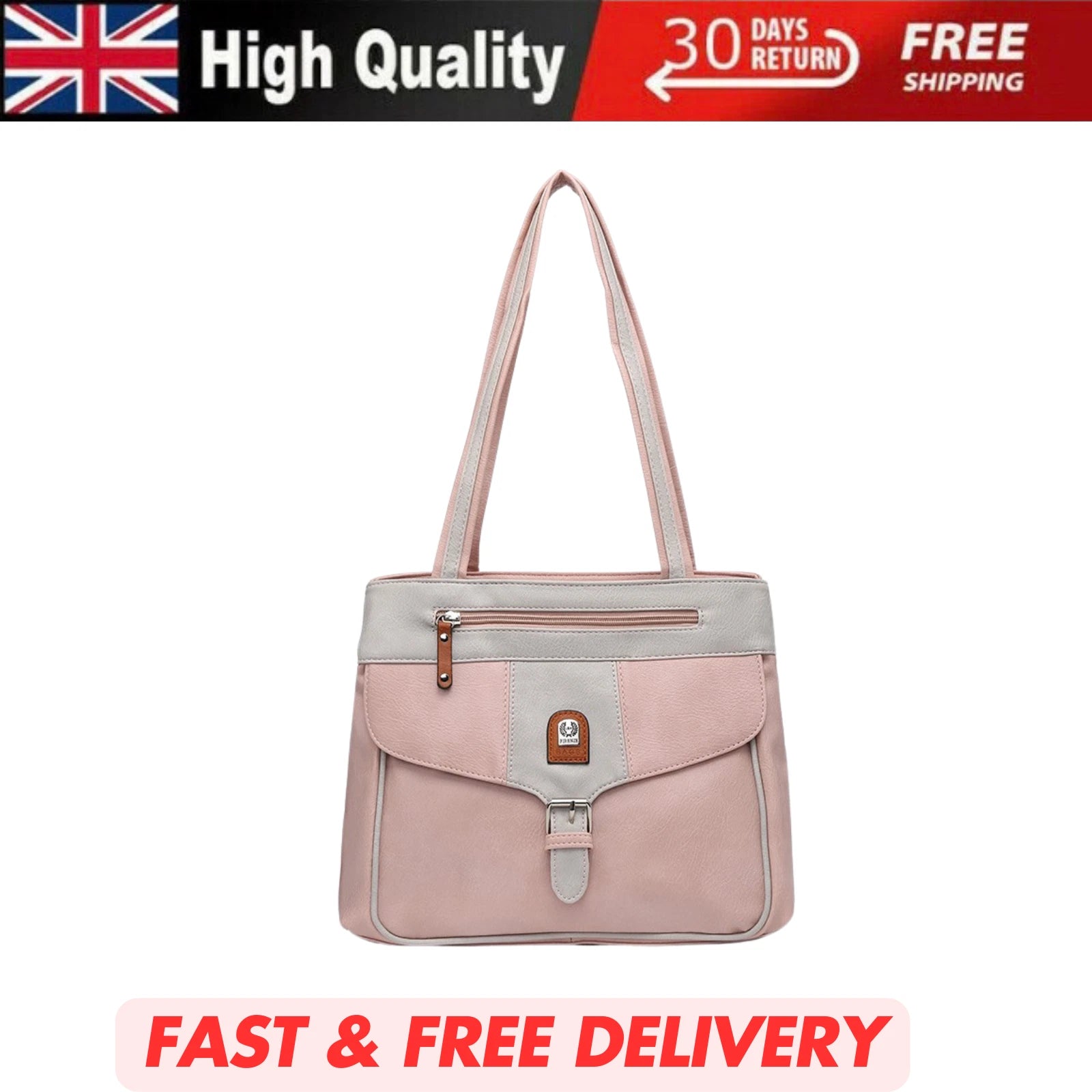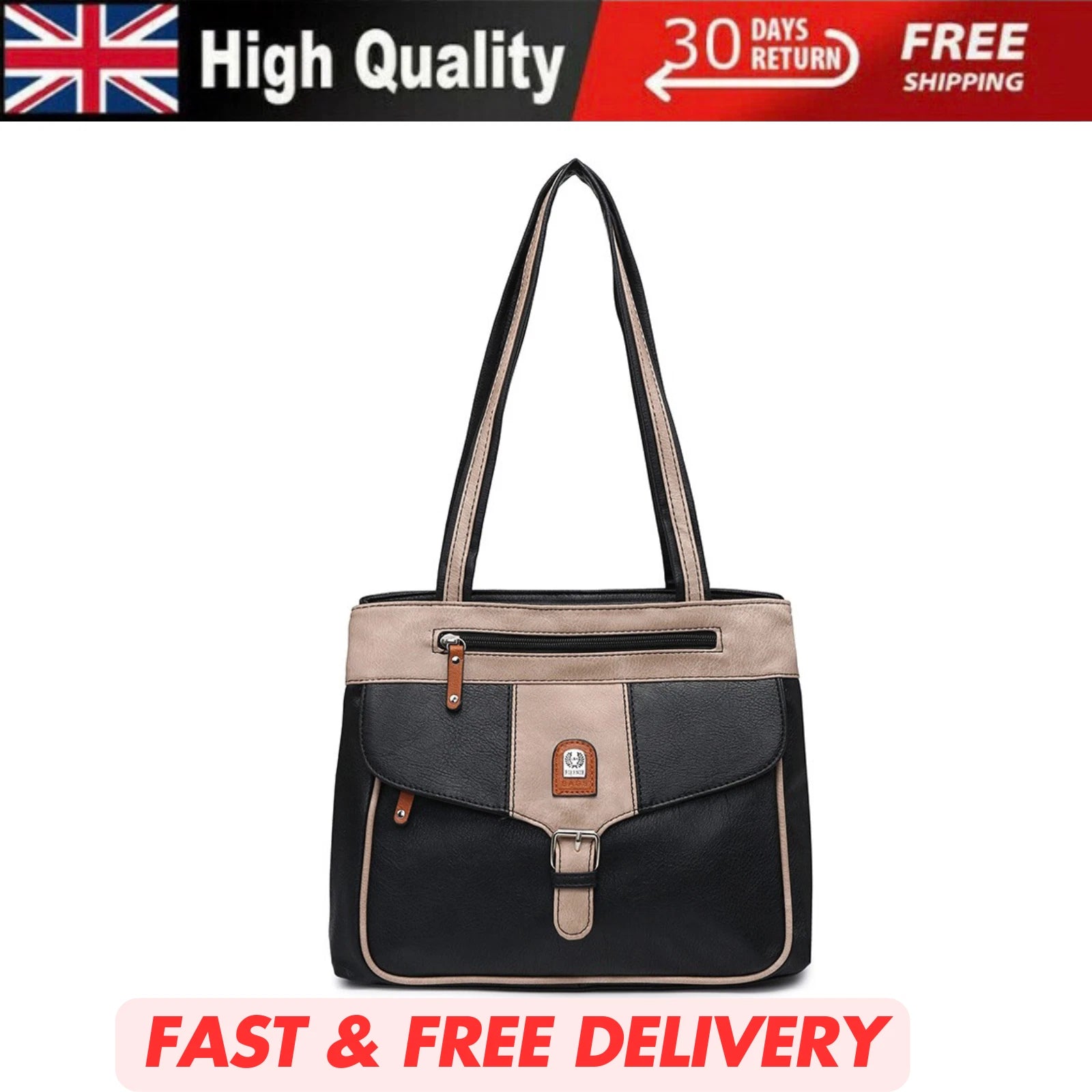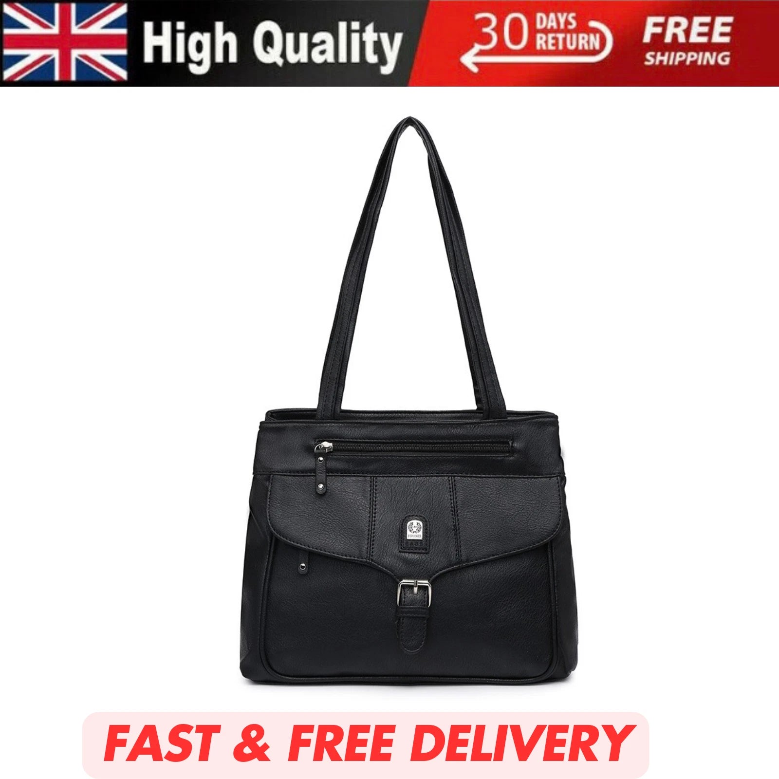 WOMEN'S VEGAN SOFT LEATHER CLASSIC HANDBAG SHOULDER BAG MULTIPOCKETS & DURABLE UK STOCK