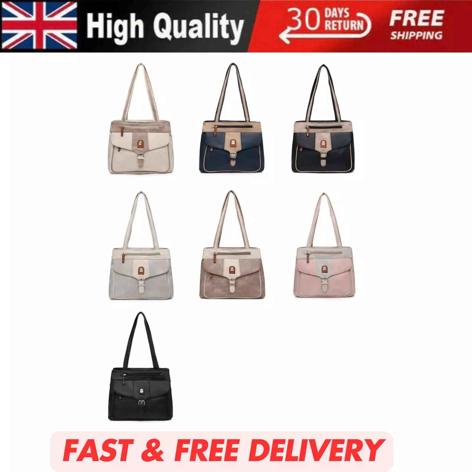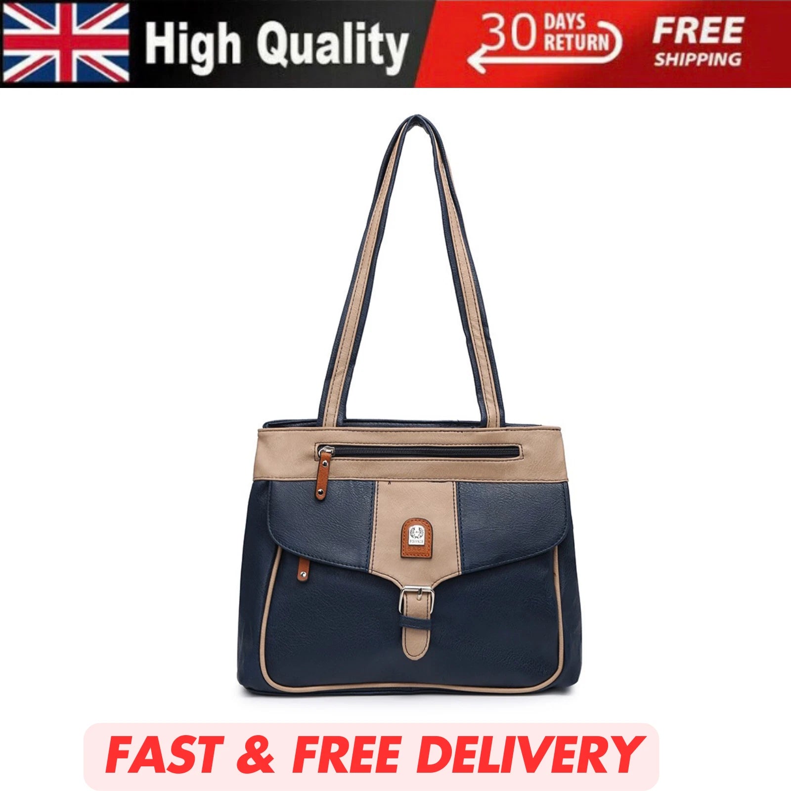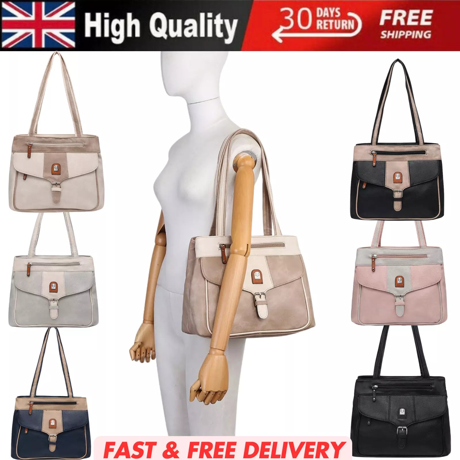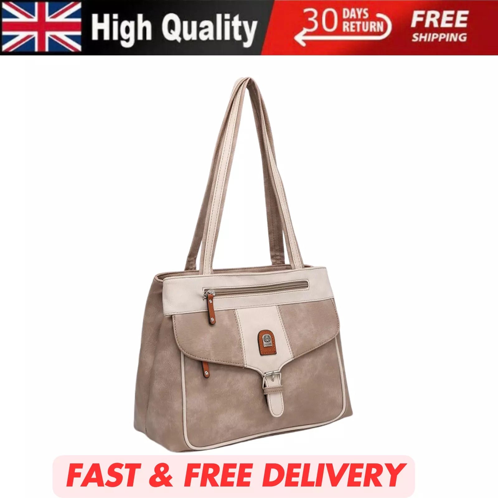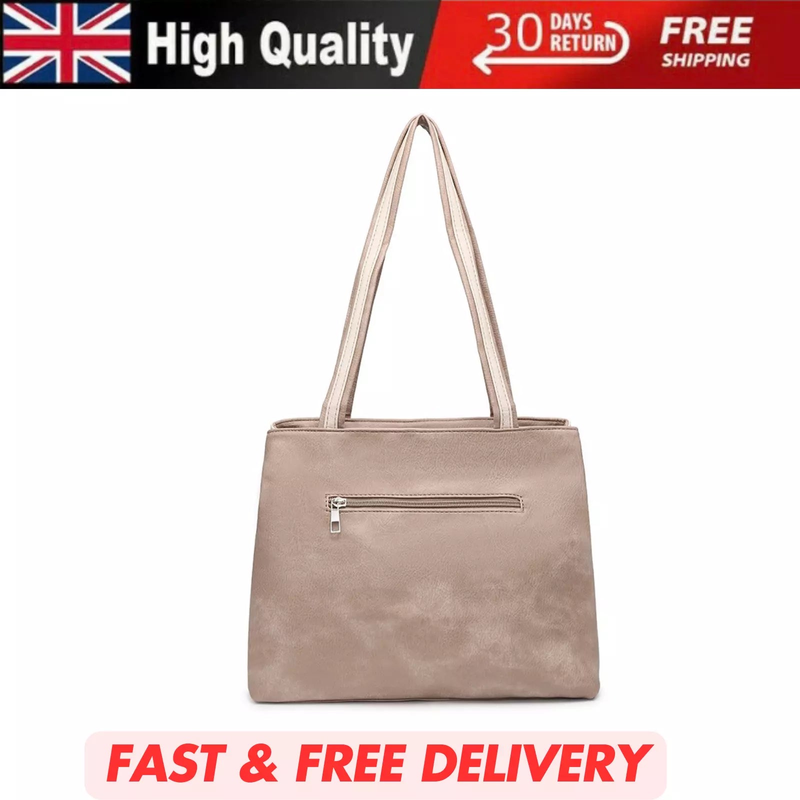 WOMEN'S VEGAN SOFT LEATHER CLASSIC HANDBAG SHOULDER BAG MULTIPOCKETS & DURABLE UK STOCK